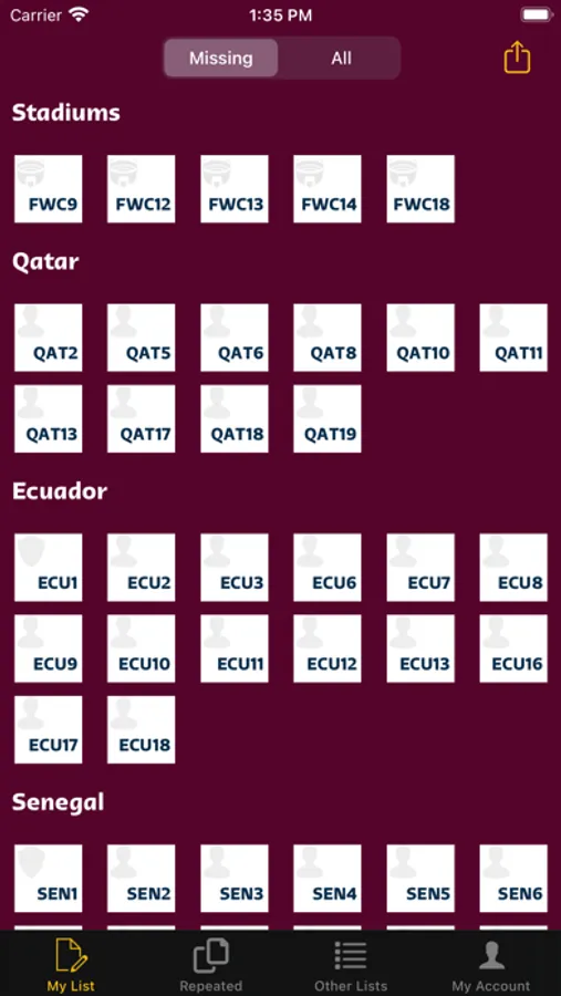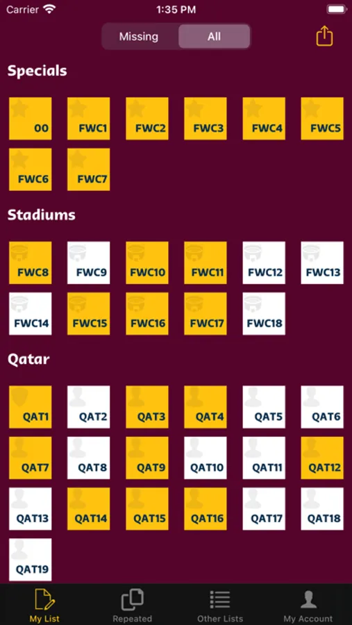 Take control of your Panini Album easily. Just check the stickers you already have and see which stickers you are missing.