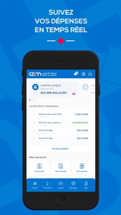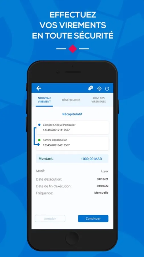- Effectuez des virements instantanés vers des comptes ouverts chez d‘autres banques au Maroc qui seront crédités en 20 secondes.