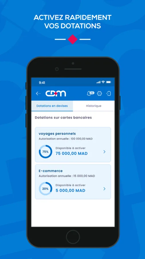 - Activez, instantanément, votre dotation voyage personnel sur votre carte bancaire à l’international pour vos voyages à l’étranger.