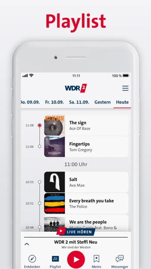 Einmal drücken und schon startet unser Livestream. Da wird das Küchenradio neidisch gucken: Ihr könnt das Liveprogramm jederzeit bis zu 30 Minuten zurückspulen. Legt fest, für welche Region Ihr Eure WDR 2 Lokalzeit hören möchtet. Dazu gibt es viele Zusatzinfos: Wie heißt der aktuelle Song und wer moderiert gerade?