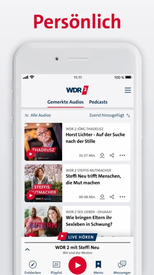 Neben dem Live-Programm haben wir noch mehr WDR 2 für Euch. In der App finden Ihr alle Folgen unserer zahlreichen Podcasts. Von „Frag Dich fit“, den Talks mit Jörg Thadeusz bis zu „Sex lieben - Ohjaaa!“ gibt es alle WDR 2 Podcasts - natürlich auch zum Offline-Hören.