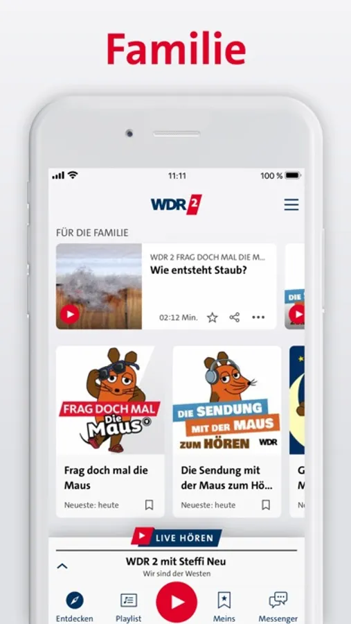 Die WDR 2 App ist für die ganze Familie da. Findet spannende Kinderhörspiele von der Maus und startet jederzeit „Die Sendung mit der Maus zum Hören“. Das bedeutet Auszeit für Mama und Papa.
