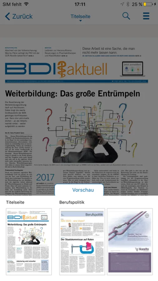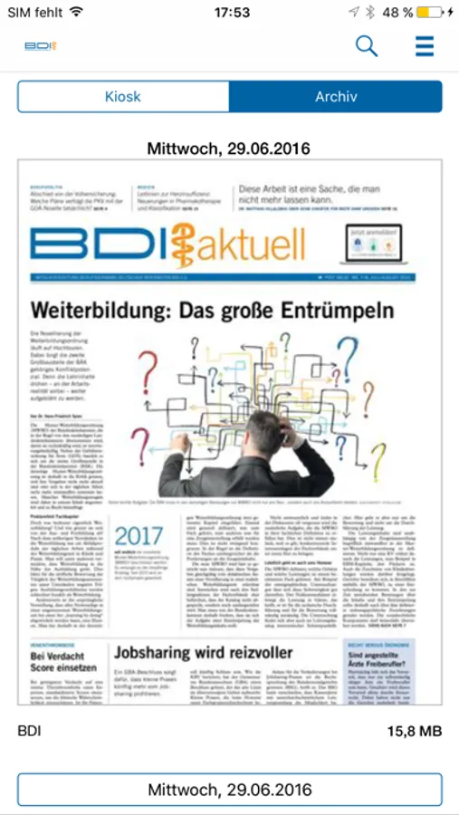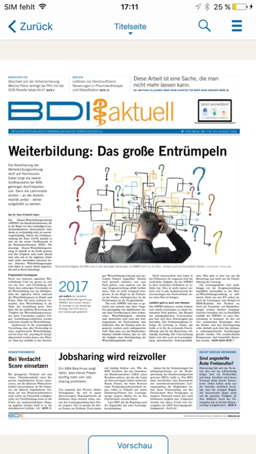 Health policy for internists, news from the association, case studies and reviews from the field of medicine as well as a wide range of further training courses in internal medicine: All this awaits you in "BDIaktuell", the members' magazine of the Berufsverband Deutscher Internistinnen und Internisten e.V. (BDI). With the app you can download the members' magazine on your smartphone or tablet and read it on the move even without an Internet connection. You can also use the integrated read-aloud function. "BDIaktuell" is an exclusive service for members of the association.