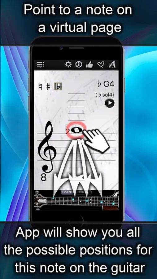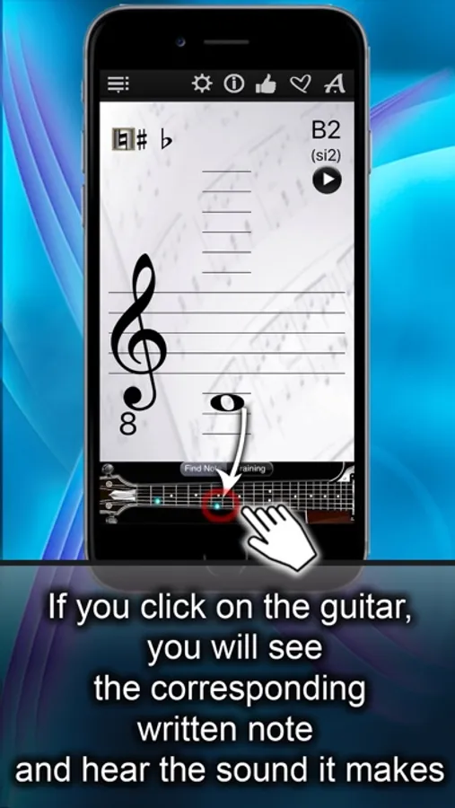 When you point to a note on a virtual page, GuitarNotesFinder will show you where this note is on a guitar and the other way around, if you click the guitar, you will see the corresponding note and hear the sound it makes.