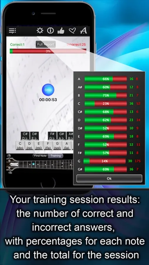 The “Note Trainer” asks for the notes showing you the frets and offers the full statistics to show where you are making mistakes, so you can measure progress in sight reading and see when you’ve exceeded your personal best.