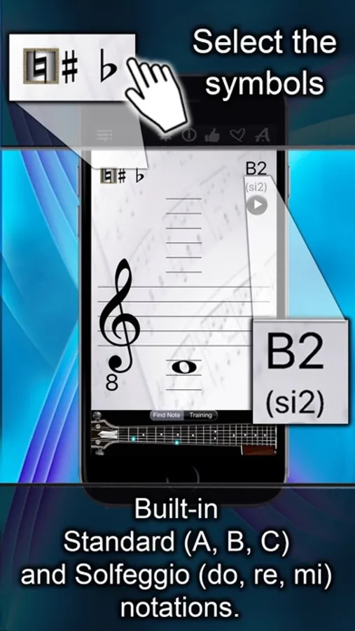 3. Built-in note sign ages: standard (A, B, C) as well as solfeggio (do, re, mi).