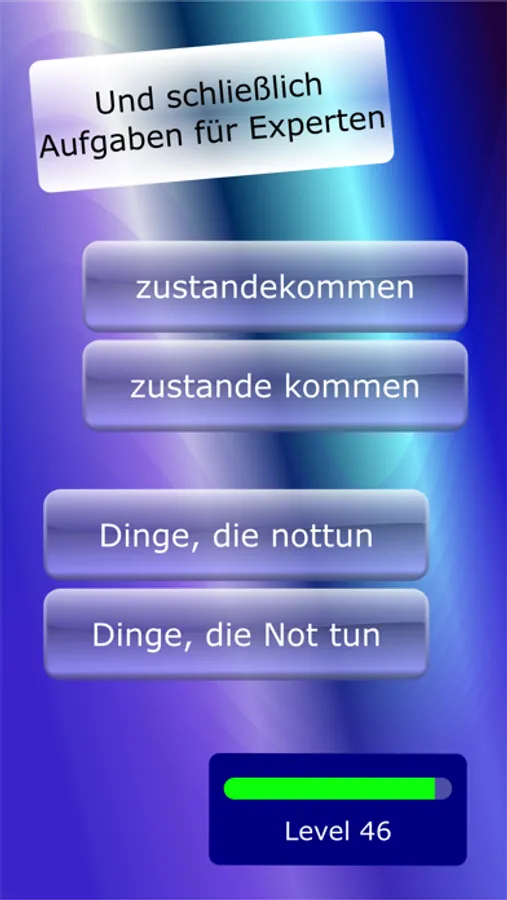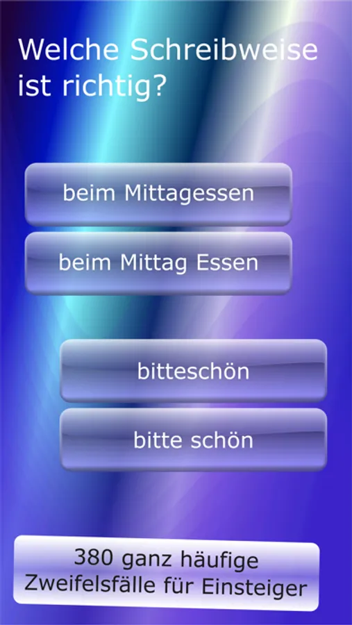 Die Getrennt- und Zusammenschreibung ist die Hohe Schule der deutschen Rechtschreibung. Hier zeigt sich, wer ein Meister ist. Dieser kleine Trainer ist für Einsteiger aller Altersgruppen und bietet ihnen einen ersten Überblick. Das Programm enthält knapp 400 Wortpaare, die dem Benutzer wahlweise getrennt oder zusammengeschrieben angeboten werden. Er muss tippen, welche Schreibweise im aktuellen Duden empfohlen wird.