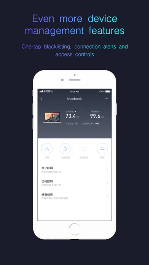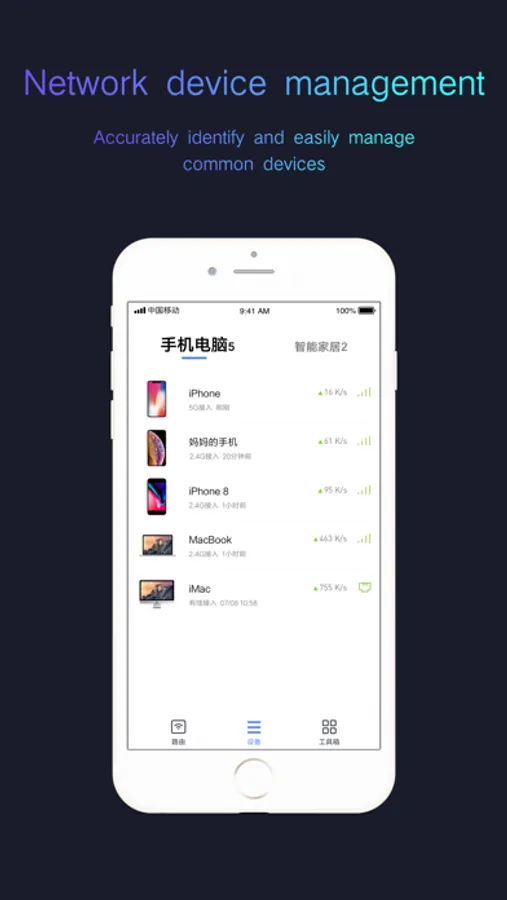 1. Device Management: Check networked devices anytime, anywhere, and view their status at a glance. You can set device-specific network and data access permissions, automatically allocate bandwidth for each device, and even set a nickname.