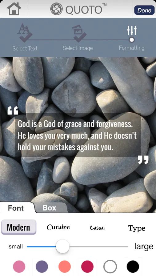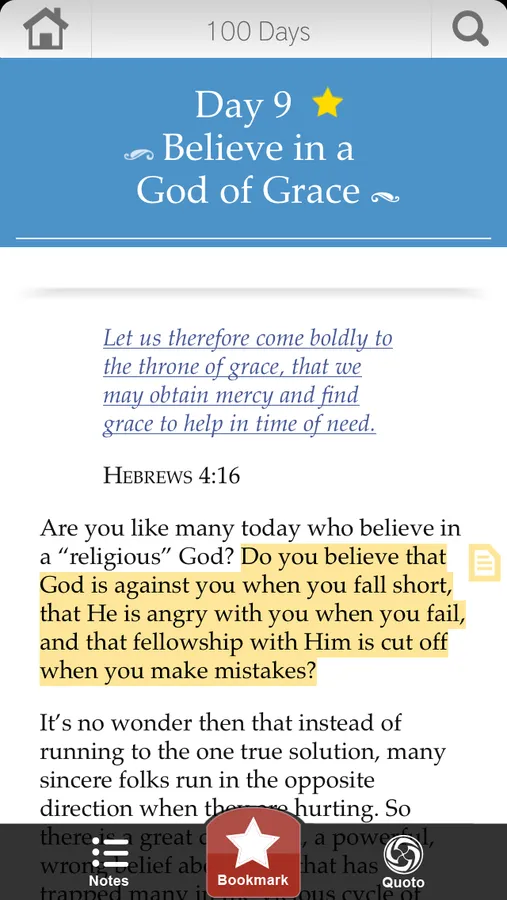 This devotional app has a devotion search feature, customized daily push notifications, and the ability to combine your favorite passages with images into beautiful shareable 'Quotos'!