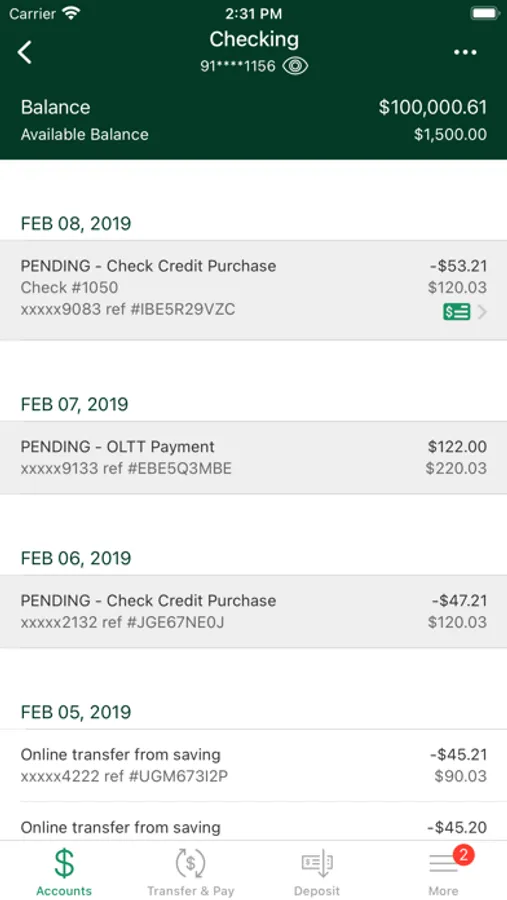 - Check your latest account balance and search recent transactions by date, amount, or check number.