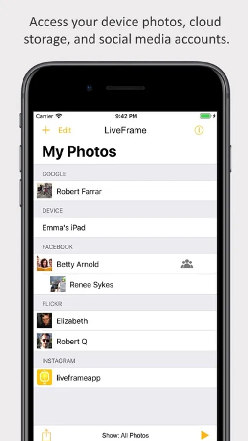 - Your personal Facebook, Flickr (>iOS 9.3.5), Instagram, Google Photos, Dropbox accounts.