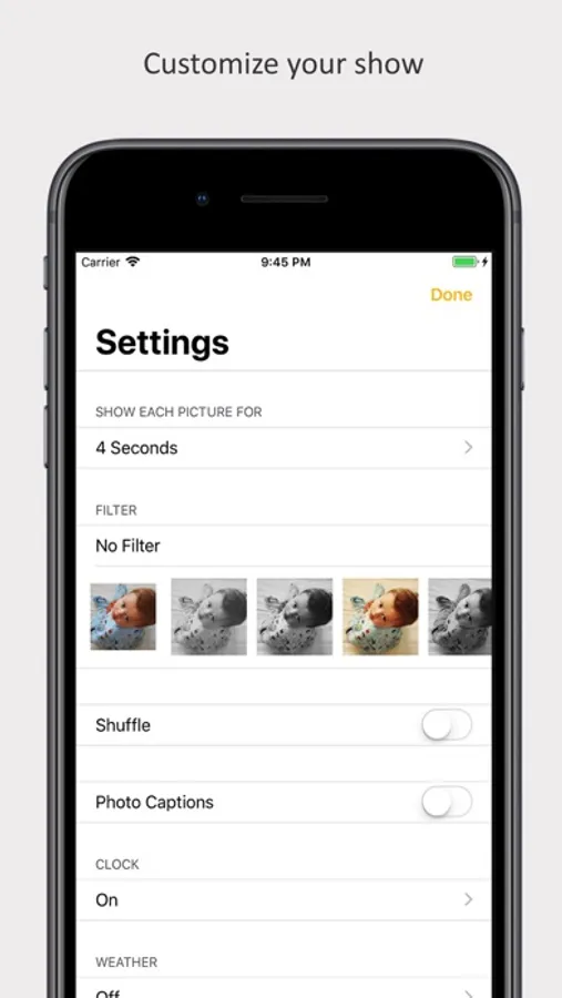 - Control photo display duration (show each image for 1 sec up to 30 min).