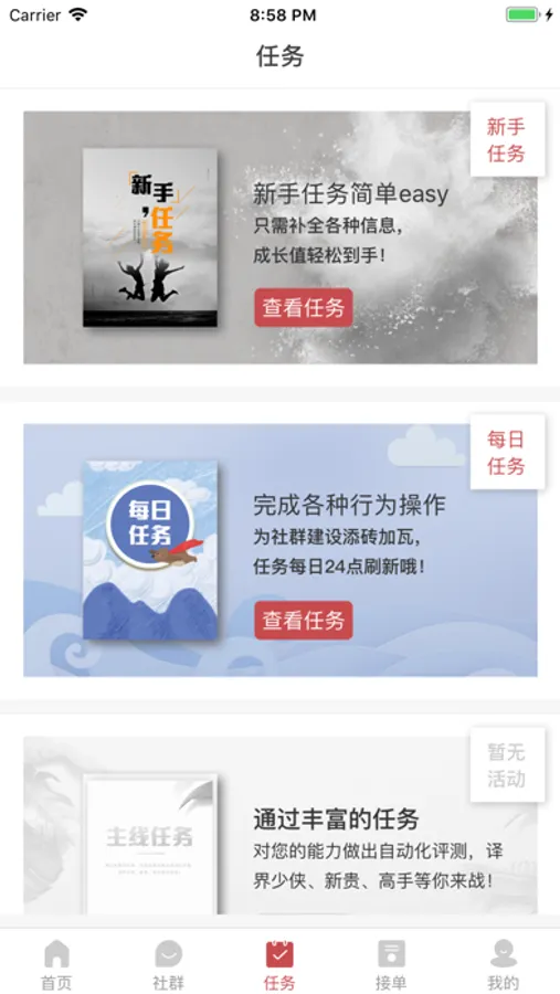 新手任务:注册完成新手任务,领取丰厚新人礼包!每日任务:每日登陆完成任务,拿奖拿到手发软!