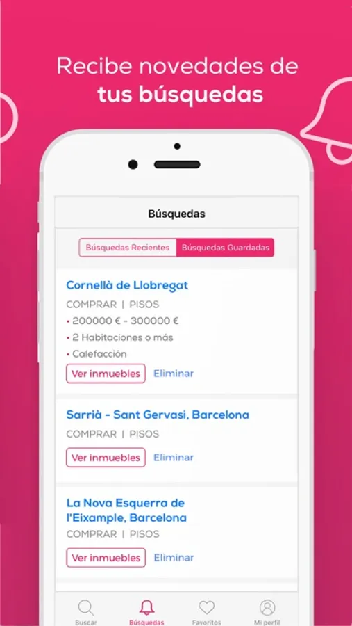 Olvídate de estar siempre pendiente. Te avisaremos al momento para que seas el primero en enterarte de todas las novedades. Únicamente debes guardar las búsquedas que te interesan y crear alertas para que, cuando se publiquen nuevos inmuebles que coincidan con las que has guardado, recibas notificaciones al instante.