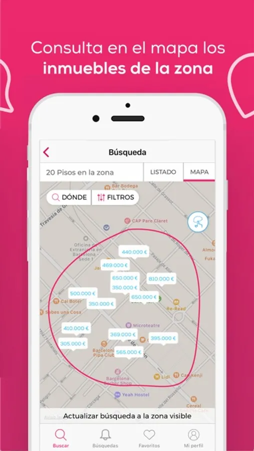 Dibuja en el mapa la zona que te interesa y verás todos los inmuebles que hay disponibles. También podrás utilizar una geolocalización concreta, ver el precio e incluso una vista previa de las características del piso o casa. ¡Y todo ello, sin salir del mapa!