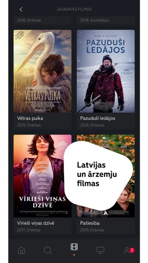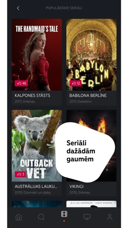 - Iespaidīgs iekļauto filmu un seriālu klāsts – gan jaunākās Latvijas filmas, gan pasaules kino. Iespēja izvēlēties audio valodu un titrus, kā arī atsākt skatīties no vietas, kur iepriekš pārtrauci.