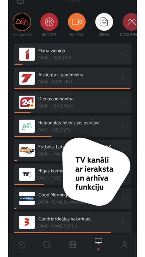 - Latvijas un ārzemju TV kanāli, TV programma, 7 dienu arhīvs un raidījumu ieraksta funkcija. Iespēju veidot savus kanālu sarakstus.