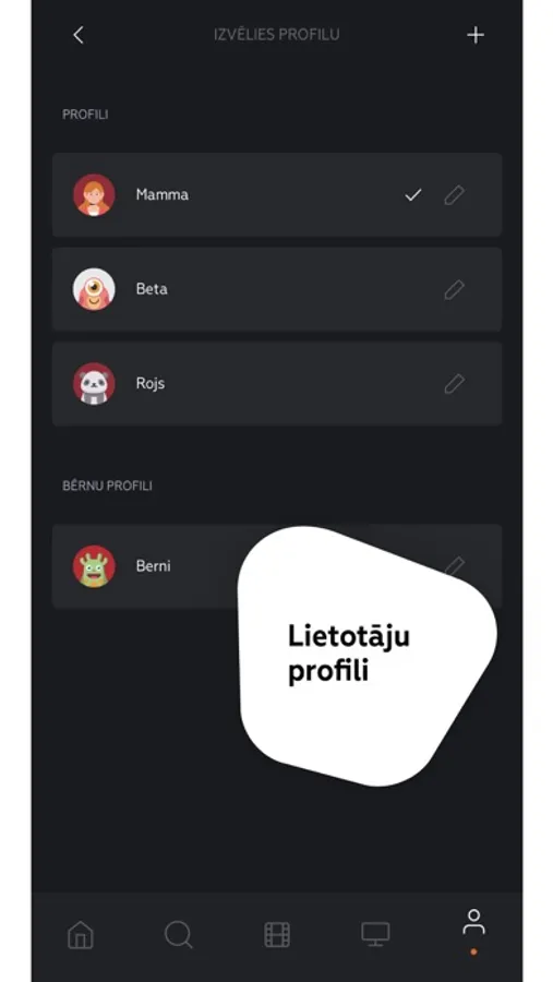 - 5 lietotāju profili, t.sk. bērna profils, kas piedāvā tikai bērniem piemērotu saturu.