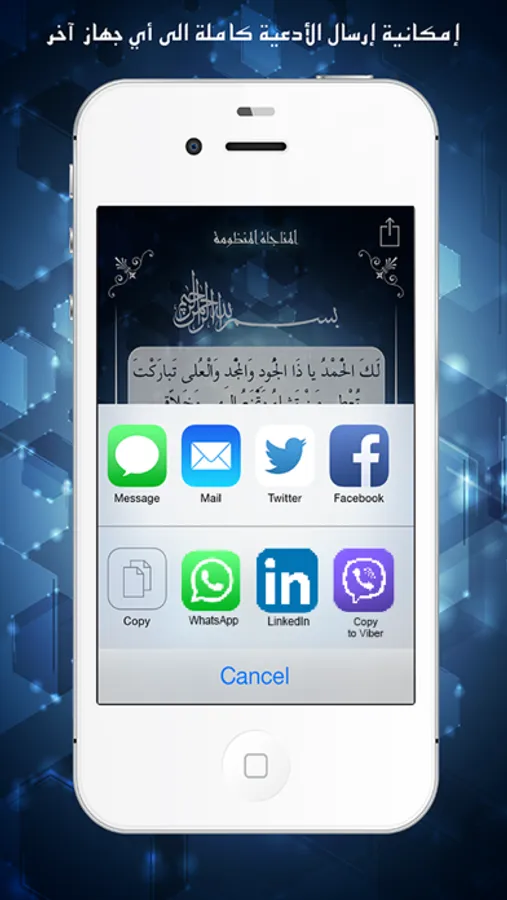 - إمكانية إرسال الأدعية بواسطة كافة تطبيقات التواصل الإجتماعي.