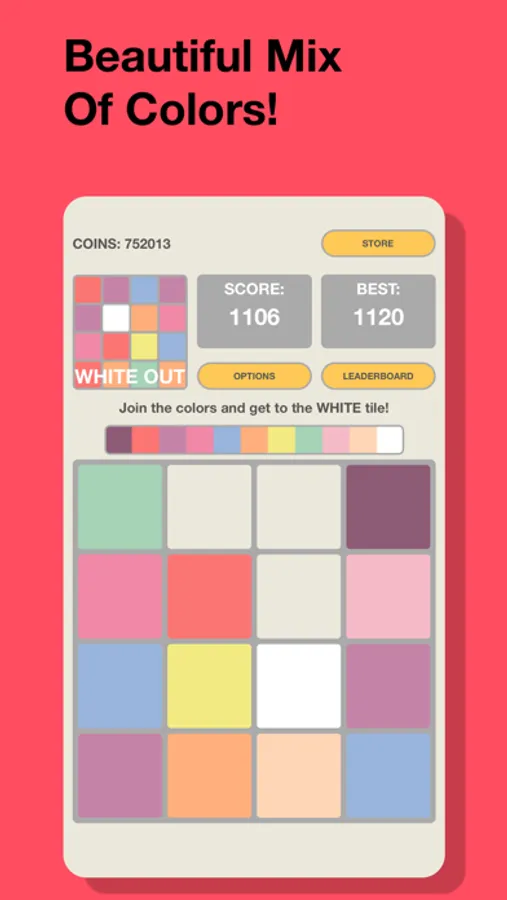 Swipe left, right, up, or down to move all tiles. When two tiles with the same color touch, they merge into one.