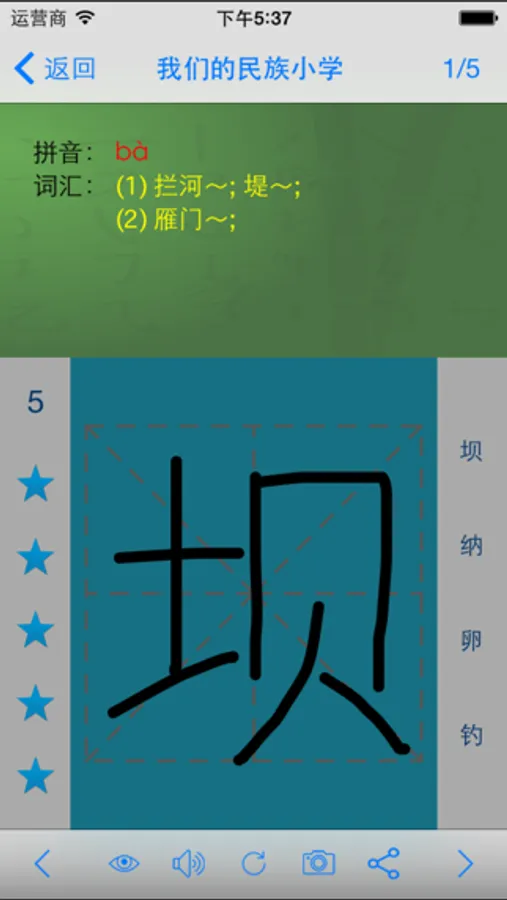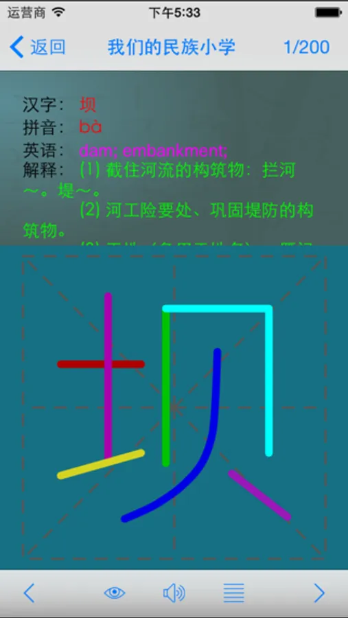 When you write Chinese characters, it is easy to make mistakes. Even though it looks very simple, such as "九,为,方,入,门", it is often that you write them incorrectly. It is important for students to write the exactly right stroke order at the beginning . This application follows the book “Commonly used Characters in Modern Chinese” released by National Committee of Chinese Characters in 1988. It will help students to learn Chinese character faster and write them correctly.