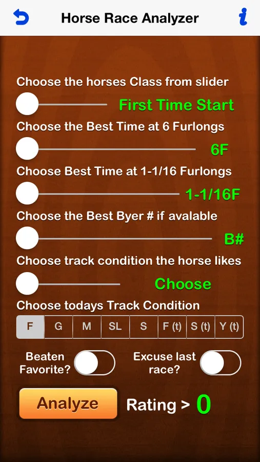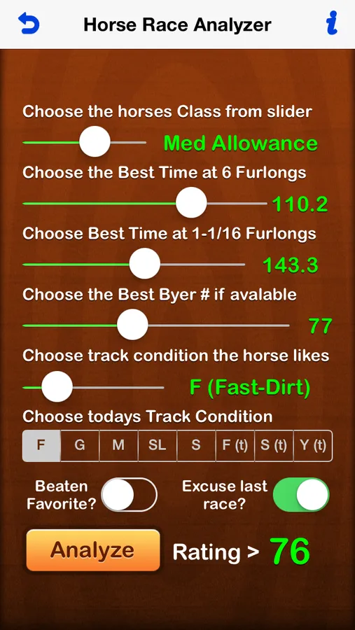 Welcome to The Horse Analizer, a powerful handicapper that utilizes a complex set of algorithms to compute a winner at any track and on any surface. Many variables are factored into determining a potential winner, including class, speed at sprints, speed at routes, track conditions, the horses propensity for those different track conditions, if a horse can handle a switch to turf, byer numbers, whether the horse was a beaten favorite last race, or had an excuse for a poor outing, is he a closer, etc. These variables are computed with the Horse Analyzer and a rating is returned, which when compared to every horse in the field, a winner can easily be determined. The analyzer makes data entry very fast and efficient by using sliders and switches rather then typing the data into a field using a keyboard. It also features a reset button with nice animation to clear the previous entry out for even faster input.