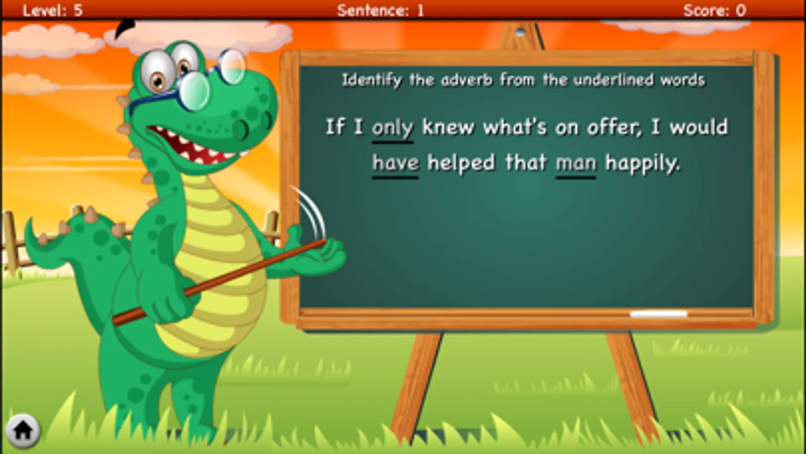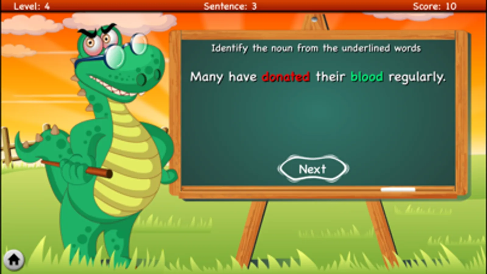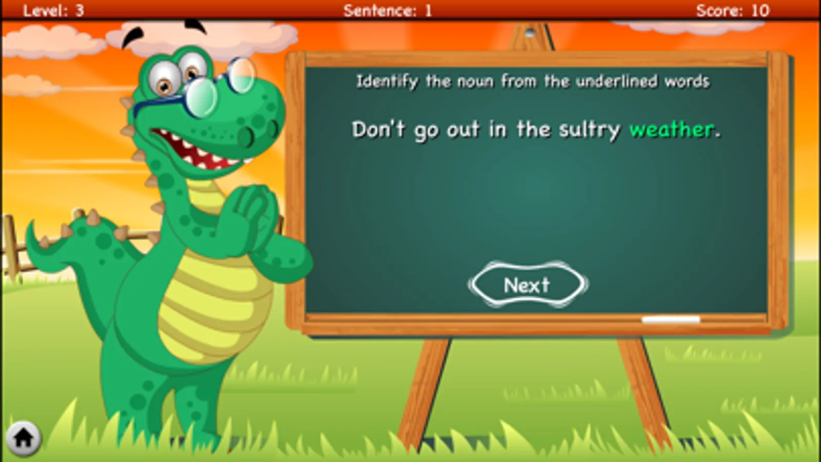 The cute dinosaur is your Grammar coach. A kid has to identify which part of speech the underlined word belongs to. There are ten levels and ten sentences in every level. New sentences and underlined words appear every time you play. So solve thousands of sentences!
