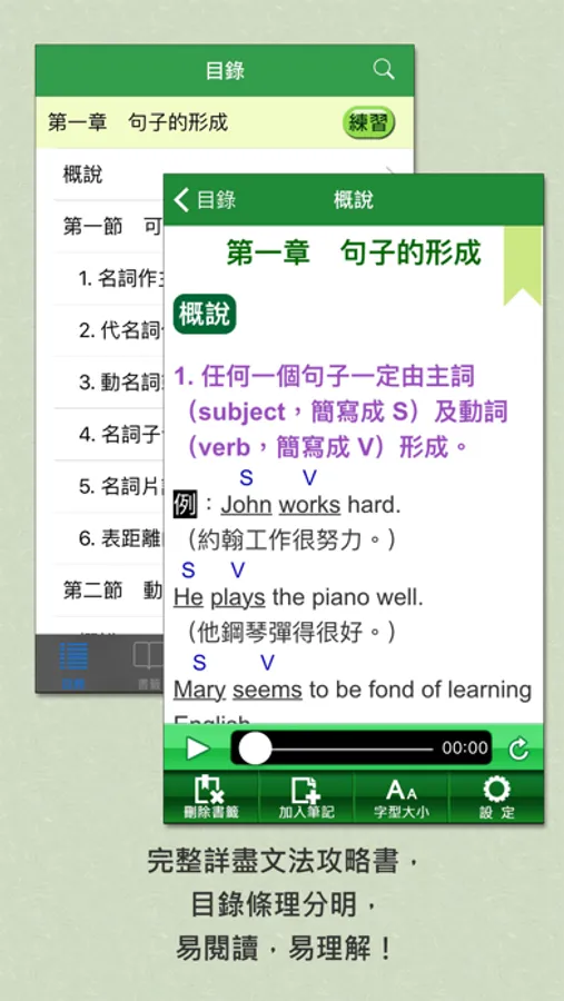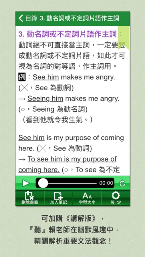 ***** App內包含《賴世雄英文文法》全書1-14章的文字內容與第1章的語音講解,第2章以後的語音講解必須在App內加購與下載!*****