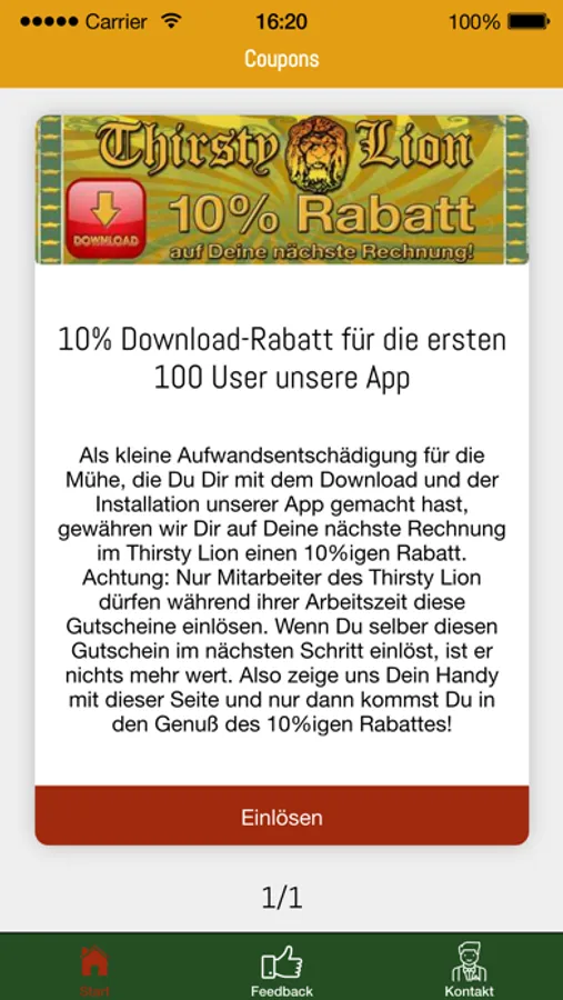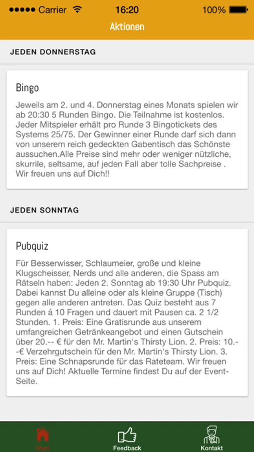 Diese App versorgt sie immer tagesaktuell mit allen wichtigen Information, Angeboten und Hinweisen aus dem Mr. Martin's Thirsty Lion in Neuwied. Er ist der (Irish-) Pub in Neuwied, eines der beliebtesten Lokale der Stadt und bietet Livemusik, Karaokepartys, Pitcher-Night, Pubquiz, Bingo und vieles mehr. Er ist außerdem lizensierte Sky-Sportsbar und verwöhnt Sportfans mit 2 Leinwänden und Großbild-TV. Im Sommer bietet der Biergarten Platz für gemütliche Runden im Freien. Ein veritables Speisenangebot sowie eine Vielzahl nationaler und internationaler Biere, Longdrinks und Cocktails lassen keine Wünsche offen. Weiterhin bietet er ein sehr gutes Publikum von 20 bis 70 und immer gute Musik von Blues über Country bis Rock und Jazz.