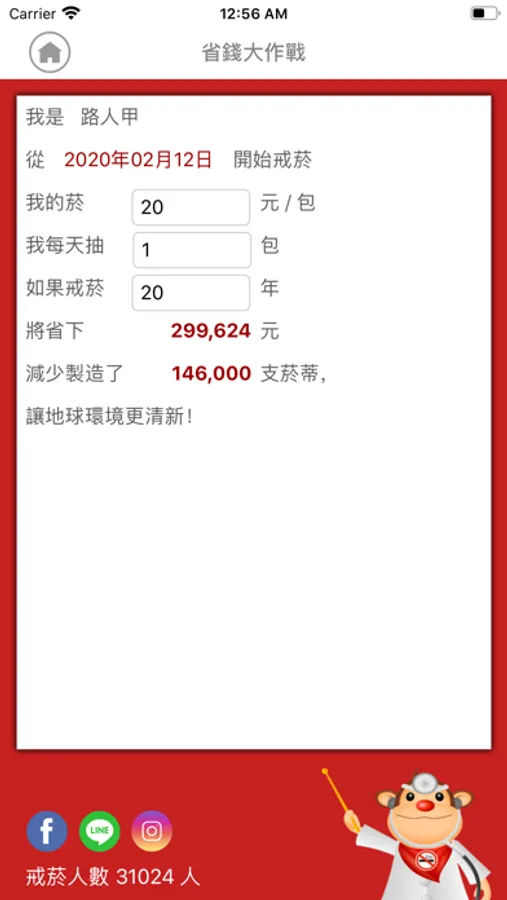 (一)省錢大作戰這部分的數據是經由一開始使用者填寫的基本資料計算而來,數字會隨著戒菸天數而增加,讓使用者了解自己目前戒菸的進度。