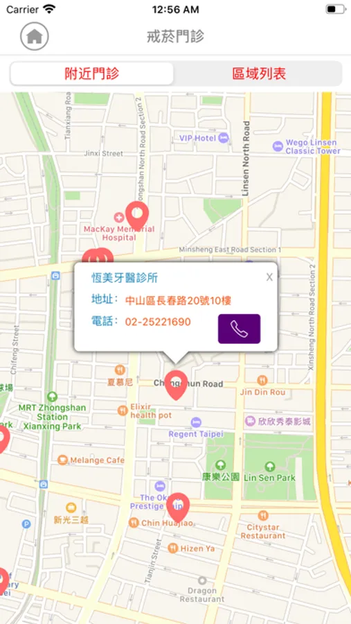 (六)戒菸門診:此功能讓使用者查詢離自己最近的戒菸門診,直接透過APP查看門診的地圖,或即刻撥打電話至門診掛號。