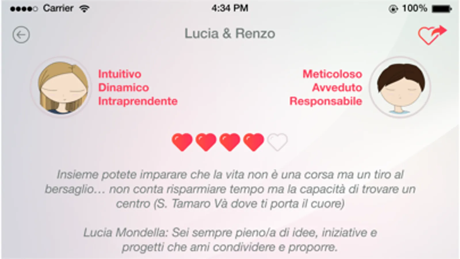 Accedendo all'app con il vostro account Facebook potrete invitare gli amici ad effettuare il test di affinità e vedere quanta compatibilità c'è. I risultati ottenuti potranno essere condivisi sia su Facebook che su Twitter velocemente e facilmente con un click. Cupido può essere utilizzata anche singolarmente per avere una breve descrizione del proprio carattere.