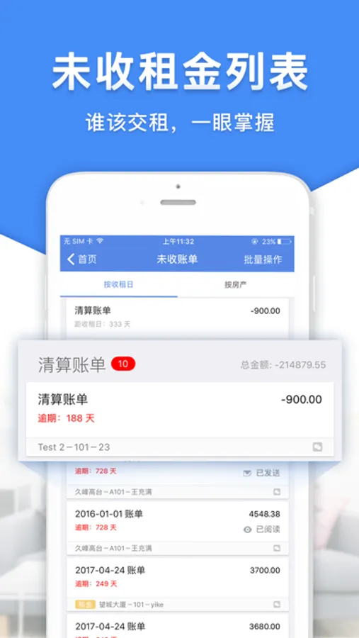 5、未收账单统一管理,按收租日远近排序,方便管理。