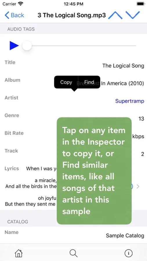 The Inspector shows you all the details of your cataloged files, including Previews, EXIF, IPTC, ID3, XMP, song lyrics, cover art, if they are included in your catalogs