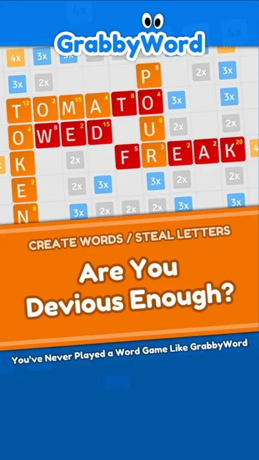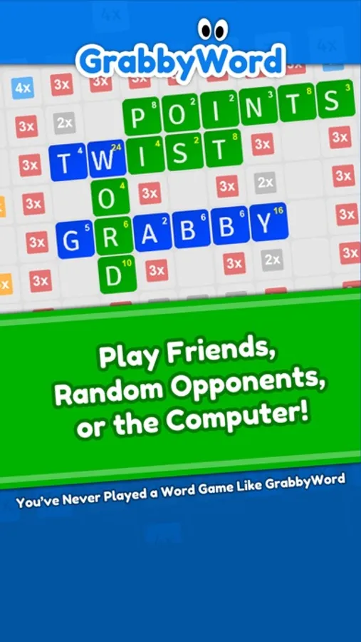 GrabbyWord is an exciting fresh twist on the typical word game. Challenge your friends, play against a random opponent, or play against Grabby and see if you can beat him. Create words on the game board to score points, but be careful because your opponents can steal your letters by using them in new words. Steal the letters back to boost your score.