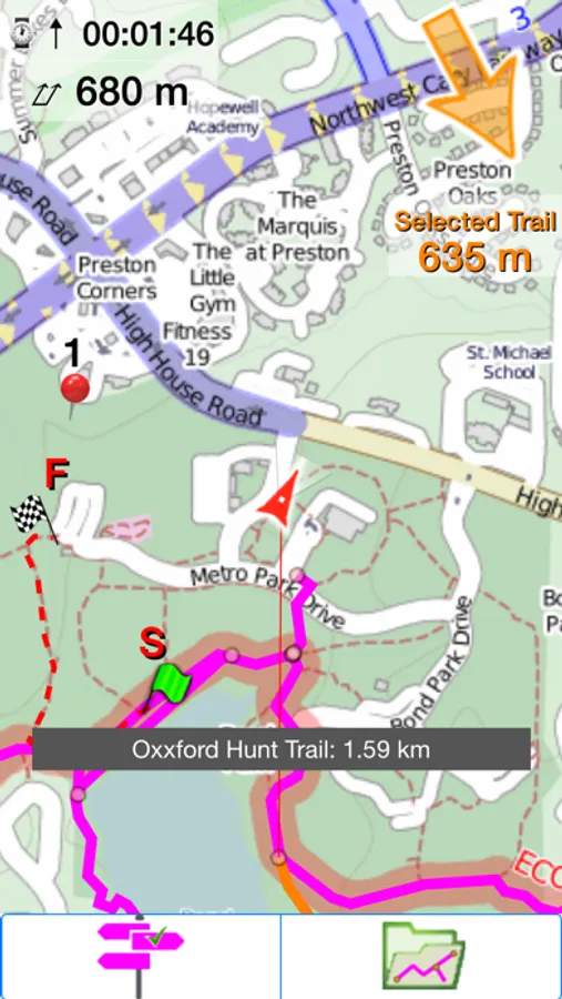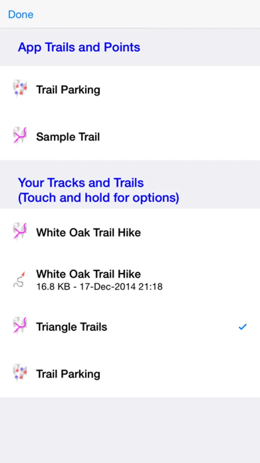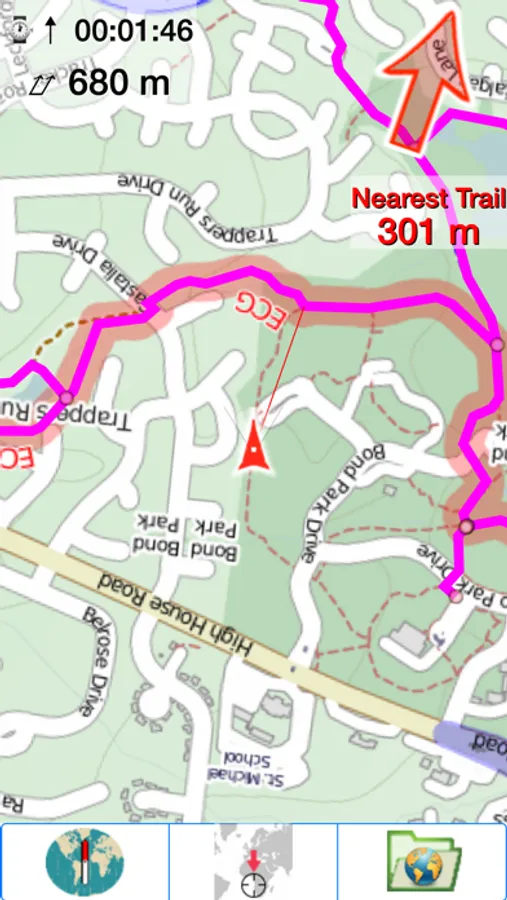 Interactive trails are more than lines on a map. They change color as you traverse them, and trigger alerts if you wander too far off the trail. Tap interactive trails to select them and access trails features.