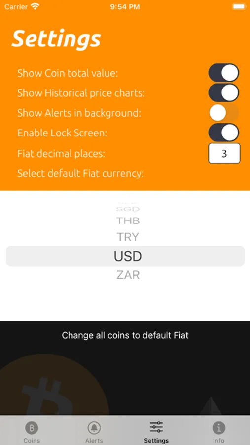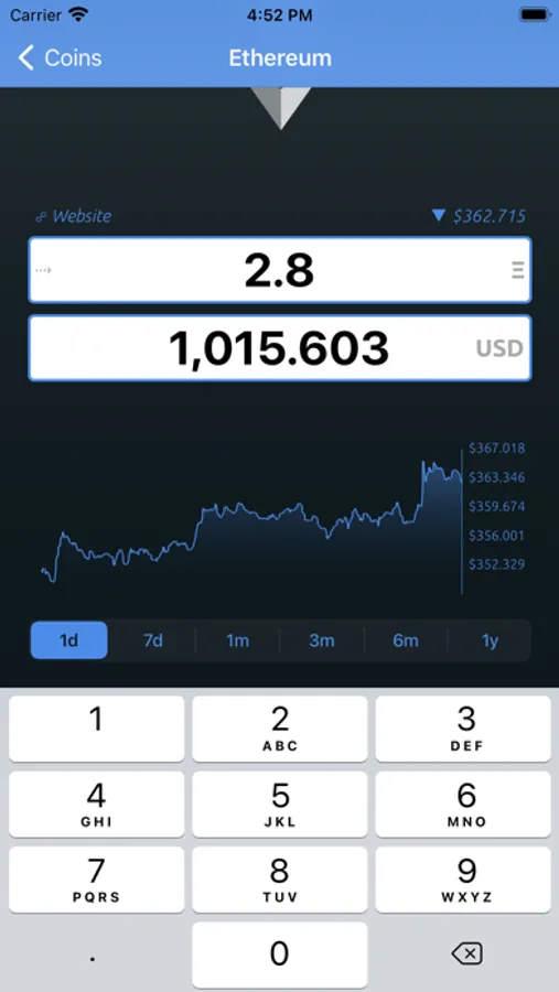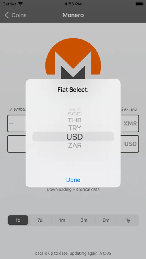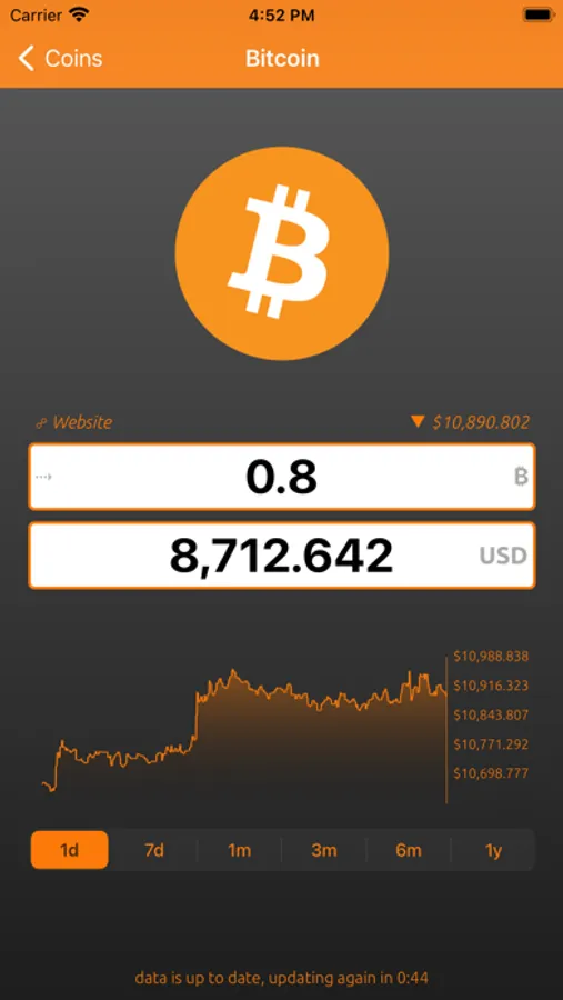 It's super easy to check how much fiat your coin is worth, and vice-versa on the coin detail page. Historical data is optionally available for any of the supported coins on it's corresponding detail page. Handy links to the official coin page are also included on this page, along with current rates and current price swing indicators.
