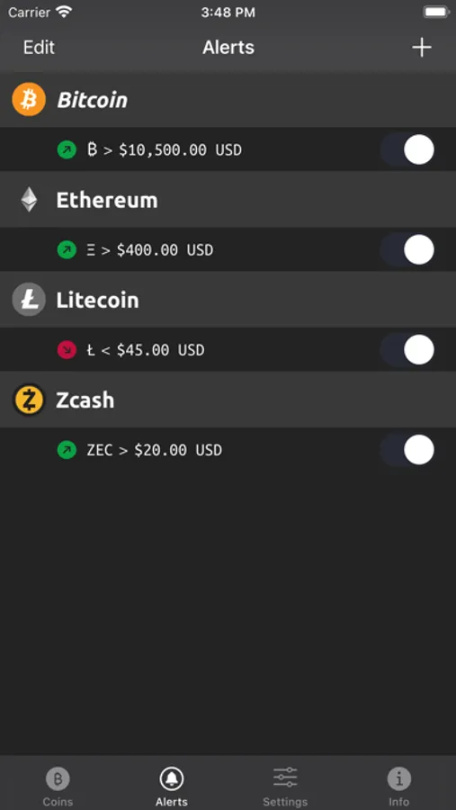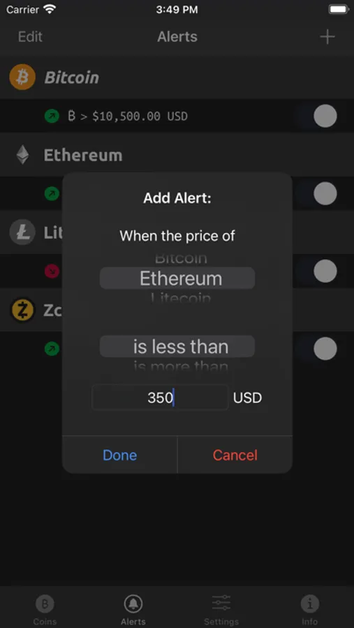 If you need to know when Bitcoin (or any alt coin) drops below, or raises above a certain price point - you can easily set price alerts to be notified.