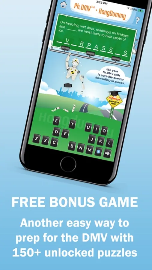 The Ph.DMV Hangdummy game is a clever spin on the classic game, where you are presented with a question and you try to guess the answer, one letter at a time. Guess the answer in as few tries as possible and save the Hangdummy from a painful fall to the ground below. The Hangdummy game gives you another method of memorizing and understanding your driver’s education test questions. Not only is the Hangdummy game educational and fun, it is absolutely FREE! All 150+ puzzles are unlocked.