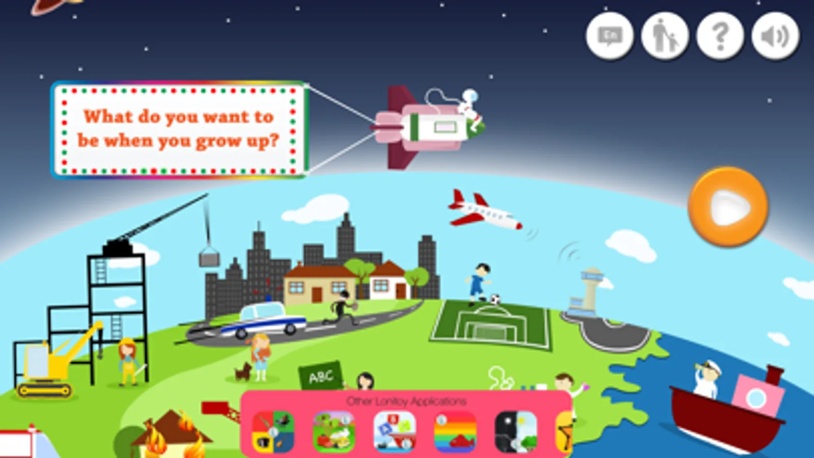 Twelve professions are introduced in this section. On each screen, a character dressed in a professional outfit or uniform appears. Each time your child taps a character, the character will say what he/she does. The four buttons on the right-hand side of the screen display items which are related to that profession.