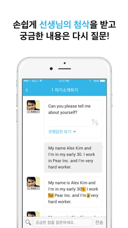 질문에 답을 해보세요. 영어선생님이 올바른 표현으로 고쳐드립니다. 이제 스마트폰으로 간편하게 영어선생님과 공부할 수 있습니다.