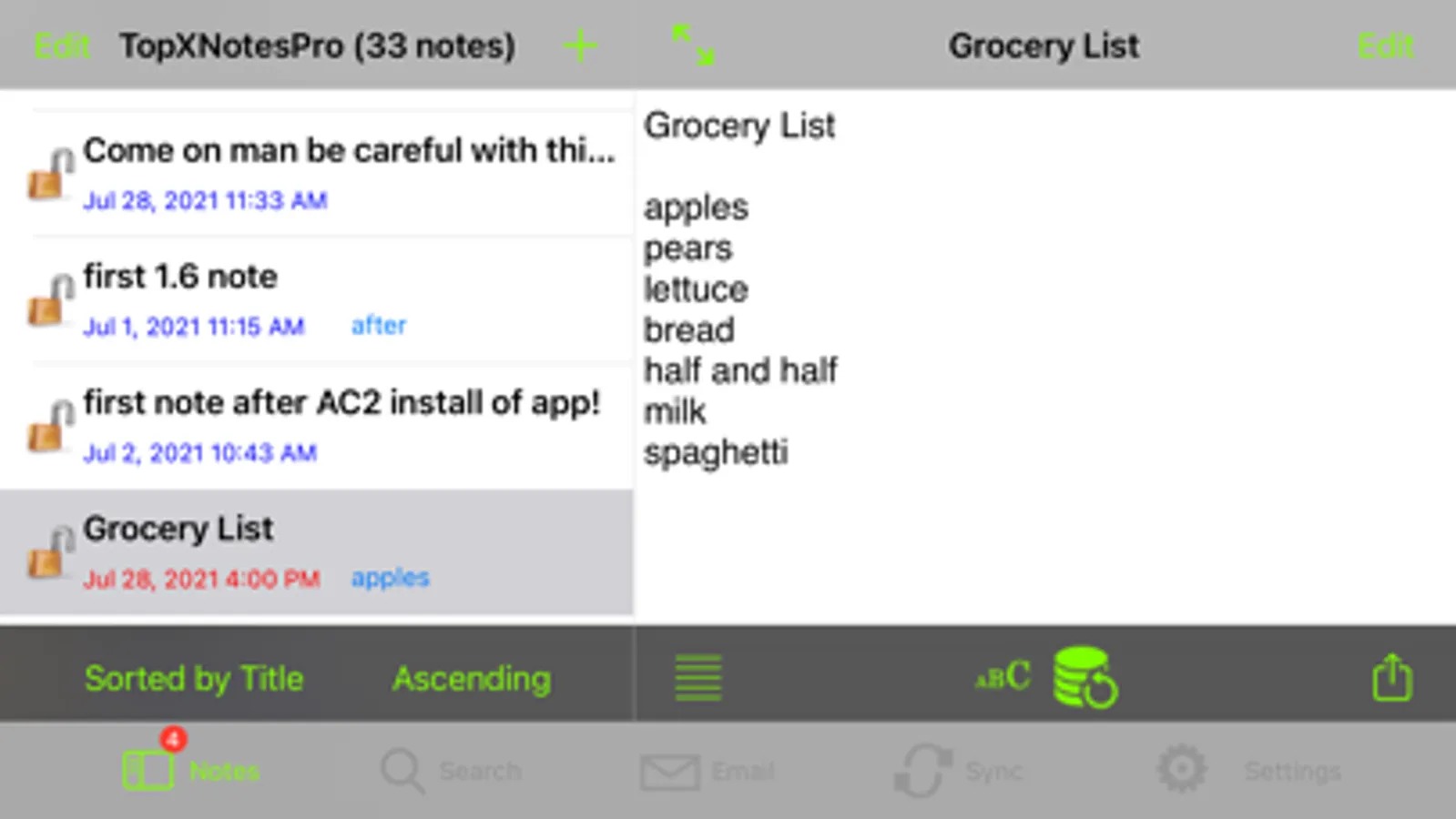 Like TopXNotes, TopXNotes Pro features note creation and editing in landscape and portrait modes, emailing a note, backup/restore to the device, clickable hot links, and note synchronization (NoteSync) with TopXNotes for Mac. You also have full access to all fonts and font sizes Apple offers in iOS. Now you can also have your notes "on the go," create new notes, edit notes, delete some and keep them in-sync with your Mac's notes.
