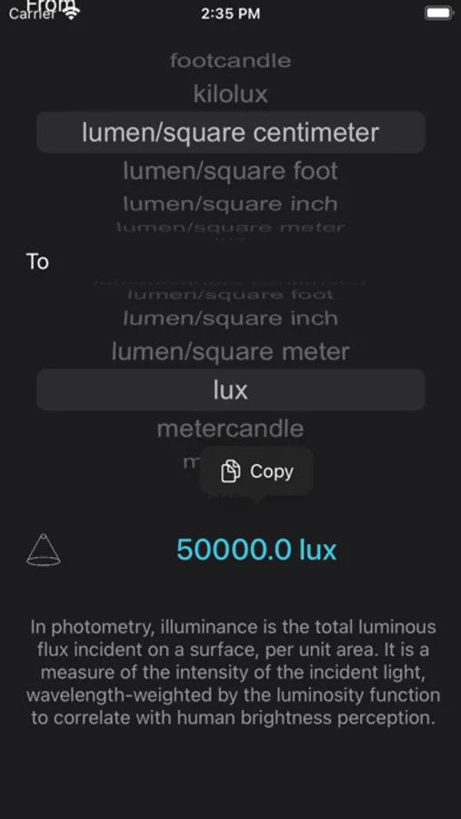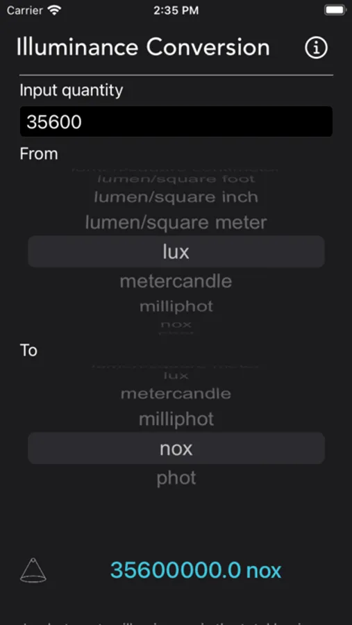 Illuminance Conversion covers a wide range of measurement units, including Foot-candles (fc), Kiloluxes (klx), Lumens per square centimeter (lm/cm²), Lumens per square meter (lm/m²), Luxes (lx), Microluxes (µlx), Milliluxes (mlx), Noxes (Nox), Phots (ph), and more.