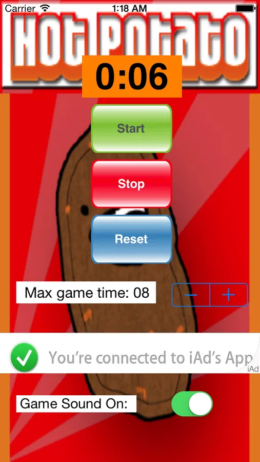 Hot Potato Timer is a timer for games of, you guessed it, hot potato. With an adjustable maximum time - from 15 to 4 seconds - you can play lightning quick games, or draw out the suspense. Each game duration is random, up to the selected maximum, so each round will be different.
