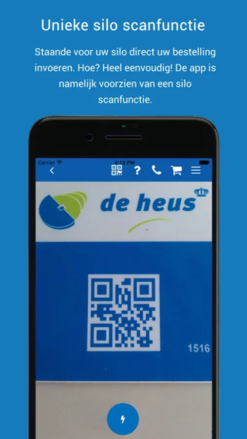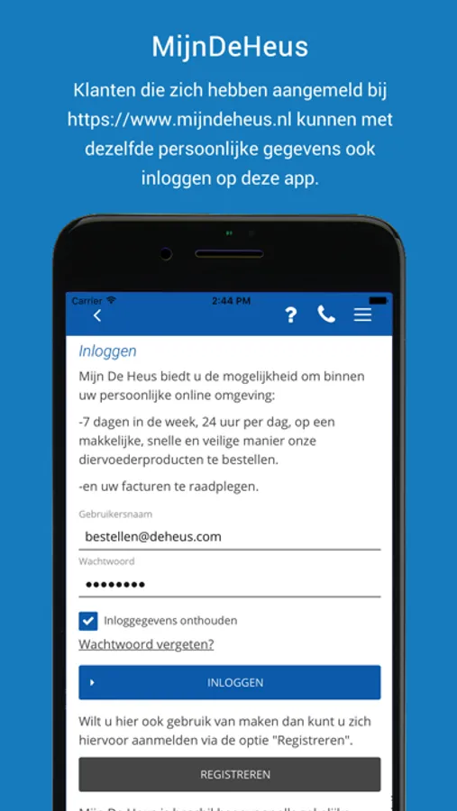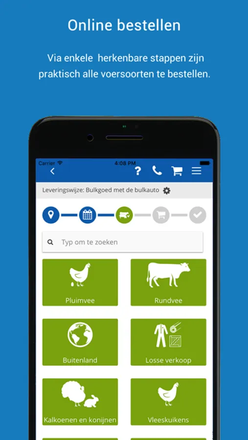 Klanten die zich hebben aangemeld bij https://www.mijndeheus.nl kunnen met dezelfde persoonlijke gegevens ook inloggen op deze app. Via enkele herkenbare stappen zijn praktisch alle voersoorten te bestellen. Ook het zakgoed dat u met de bulkauto of zakgoedauto geleverd wenst te krijgen, is eenvoudig via de app te bestellen.