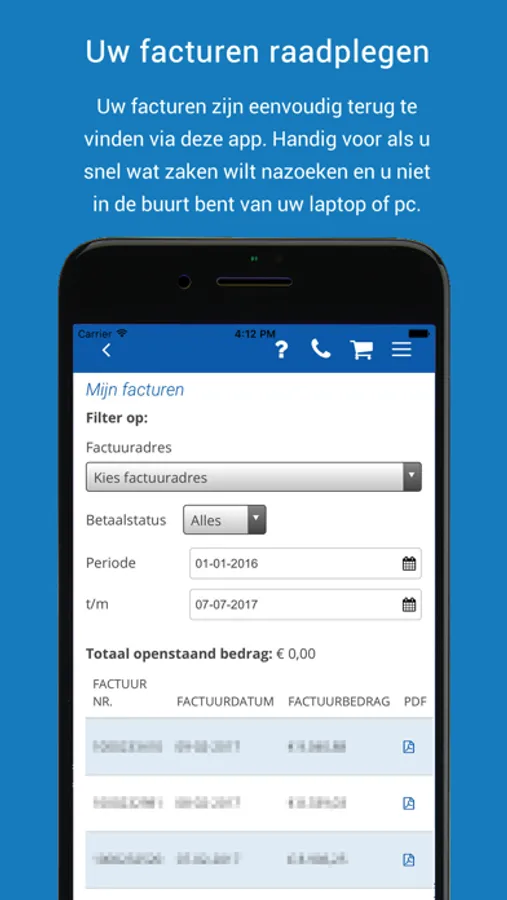 Als u hebt aangegeven uw facturen digitaal te willen ontvangen, dan kunt u ze ook eenvoudig terugvinden via deze app. Handig voor als u snel wat zaken wilt nazoeken en u niet in de buurt bent van uw laptop of pc.