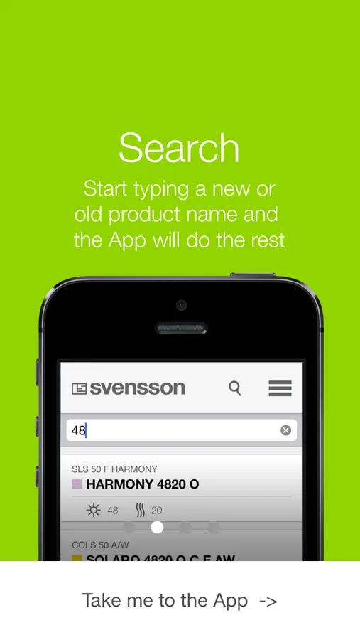 Svensson Converter is the App that will help you get to know our product families – Harmony, Luxous, Obscura, Solaro and Tempa. Enter an old product name to get the new one, or vice versa. Explore the product range of each family, click to get extended information at the Svensson website. The app comes in English, Dutch, German, Russian and Spanish.