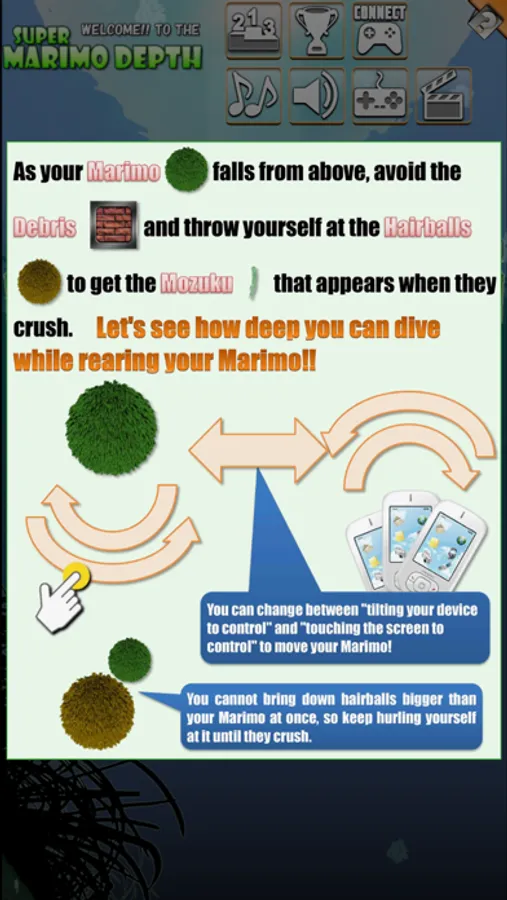 "Super Marimo Depth" is a deep sea adventure game where players help raise marimo as it sinks into the sea - showering it with affection to help it grow and avoiding obstacles as it delves deeper and deeper.