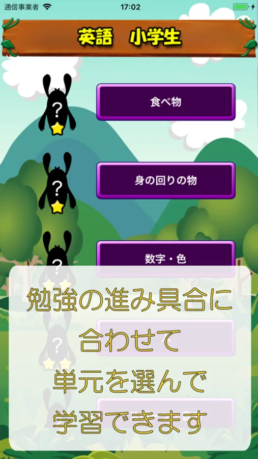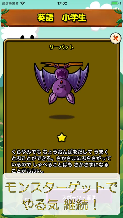 小学生5年生や6年生が、英語を学び始めるときに便利なアプリ!単語や簡単な文章を学べます。勉強したい単元を選択して、効率的に勉強できます。4択のクイズ形式という使いやすさ、勉強のご褒美にモンスターを集めていく楽しさで、子供が継続的に勉強します。(iPad、iPhoneの両方に対応)
