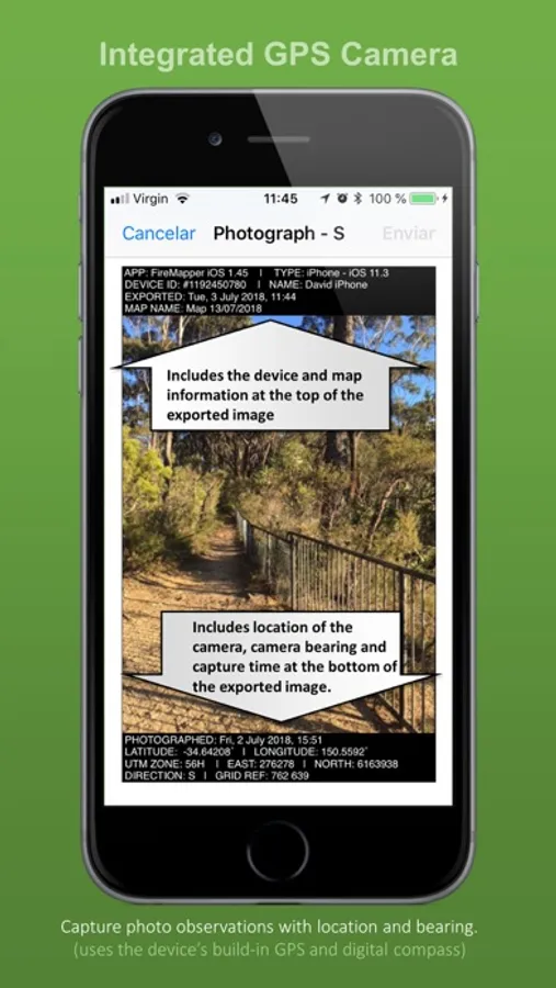 Take geo-referenced photos and display the location and bearing on the map.